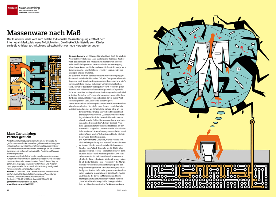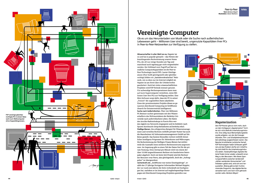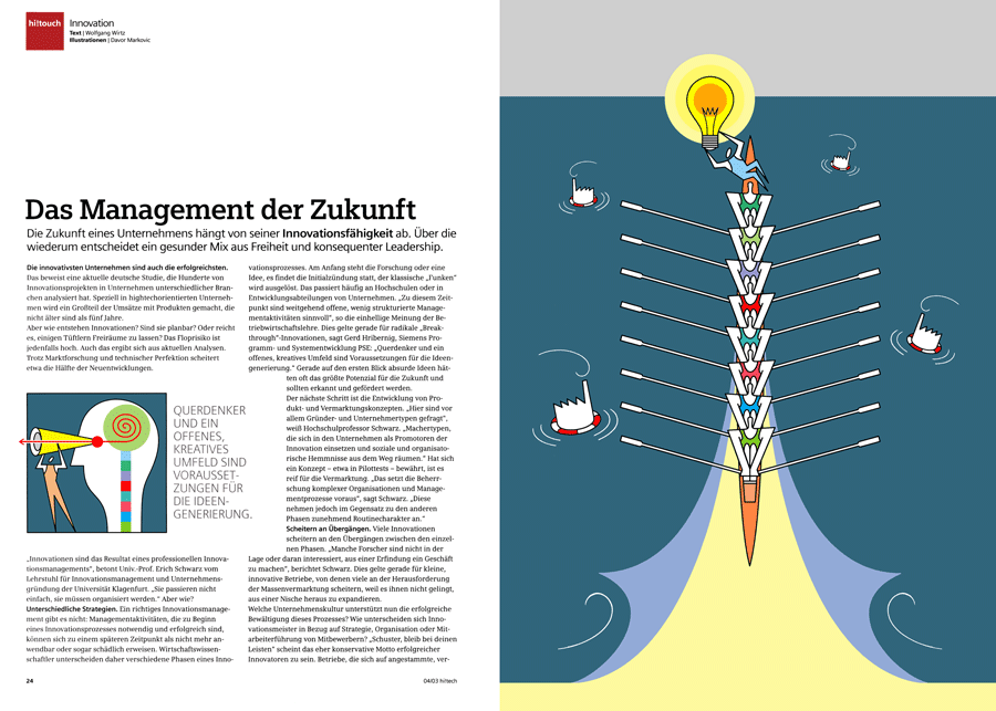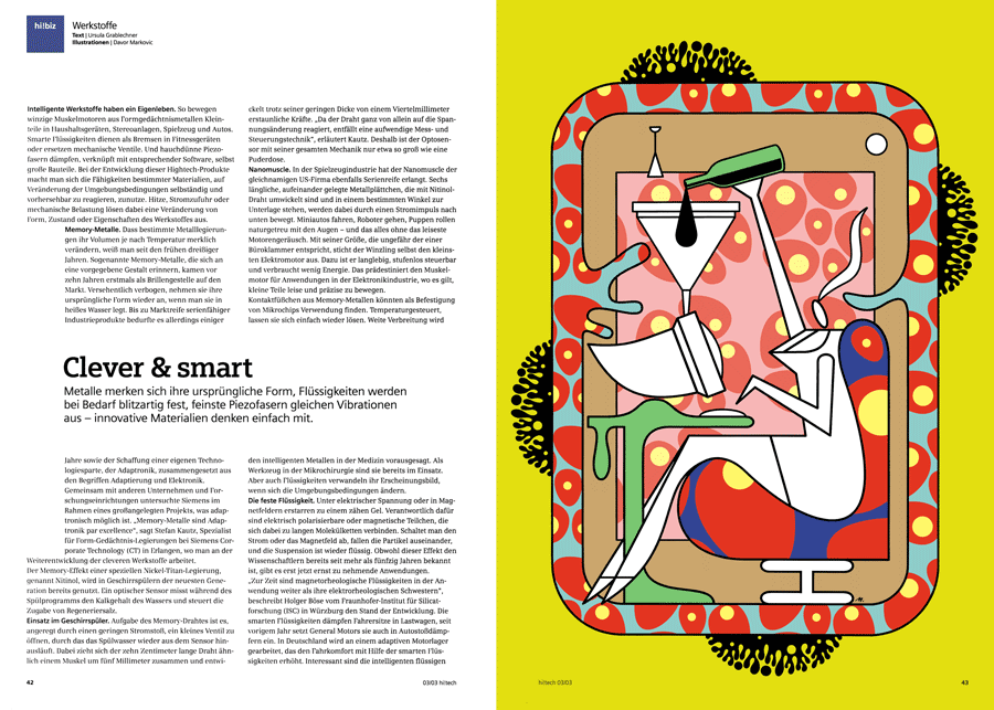 hi!tech – Das Zukunftsmagazin von Siemens Österreich ist eine Zeitschrift, die Themen der innovativen Technik und Technologie in allen Bereichen der zeitgenössischen Gesellschaft behandelt. Themen dieser Art bieten einen idealen Stoff für effektive konzeptuelle Illustrationen. Einige Illustrationen solcher Art von davor markovic design liegen in der Präsentation vor.
