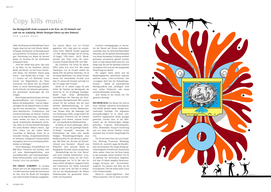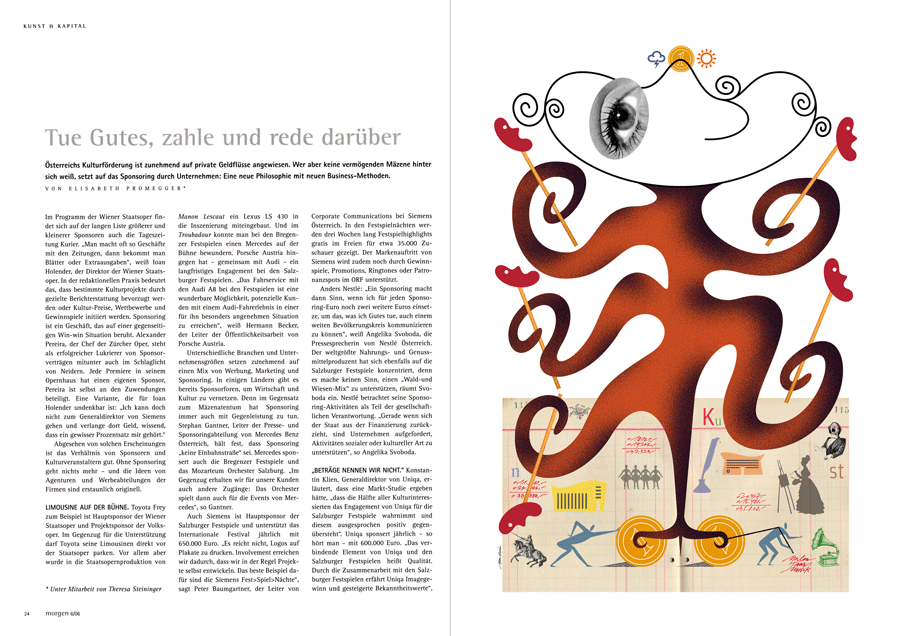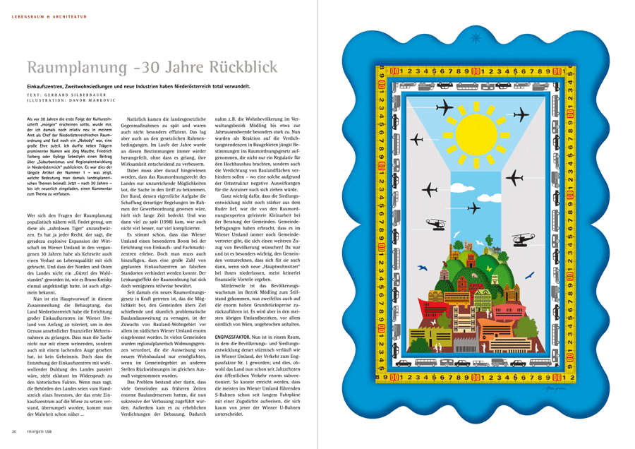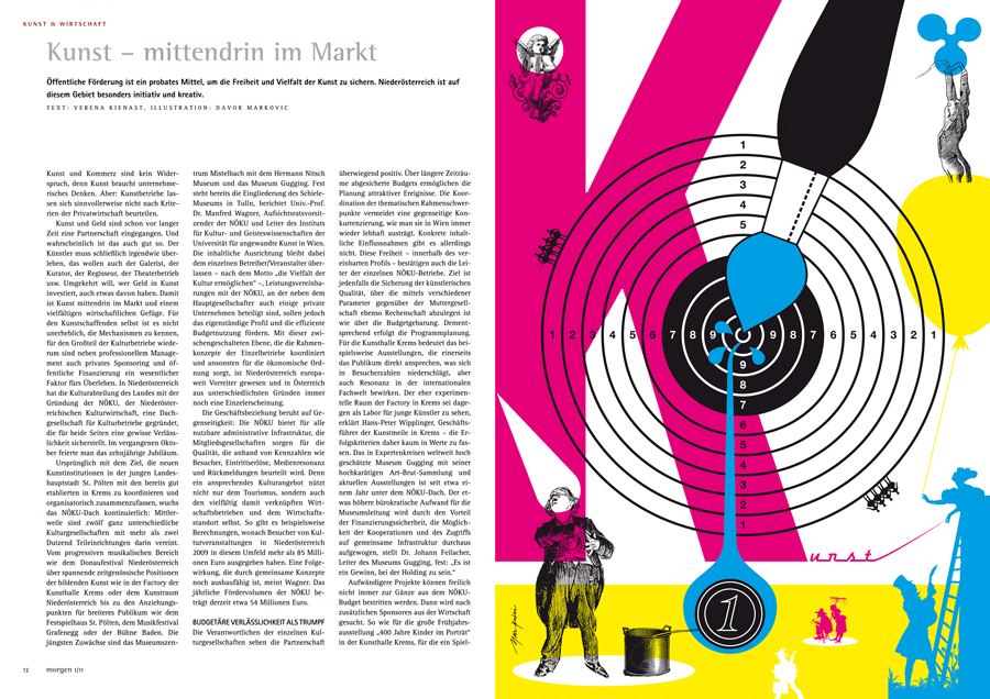 Das Niederöstereichische Magazin Morgen berichtet über alle Bereiche des Kunstlebens von der Literatur über die bildende Kunst bis zum Film. Wissenschaft, Kunst und Kultur werden darin in Form von Essays und Bilddokumenten dargestellt. Bestimmte Themen wurden mit konzeptuellen Illustrationen von davor markovic design begleitet.