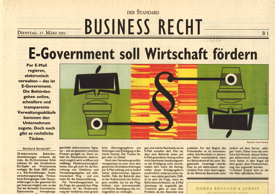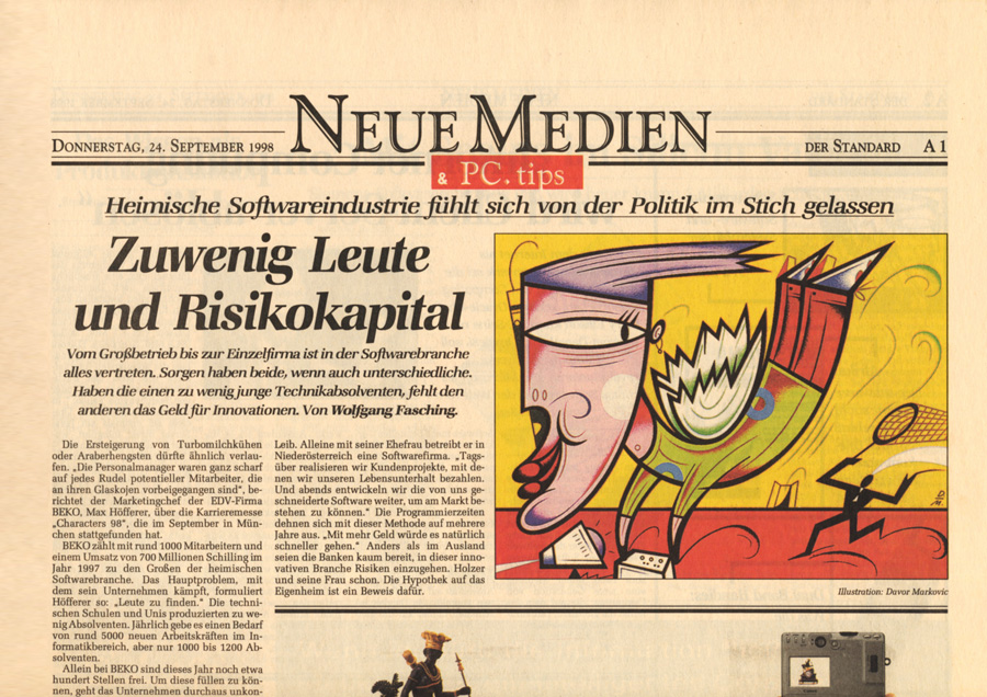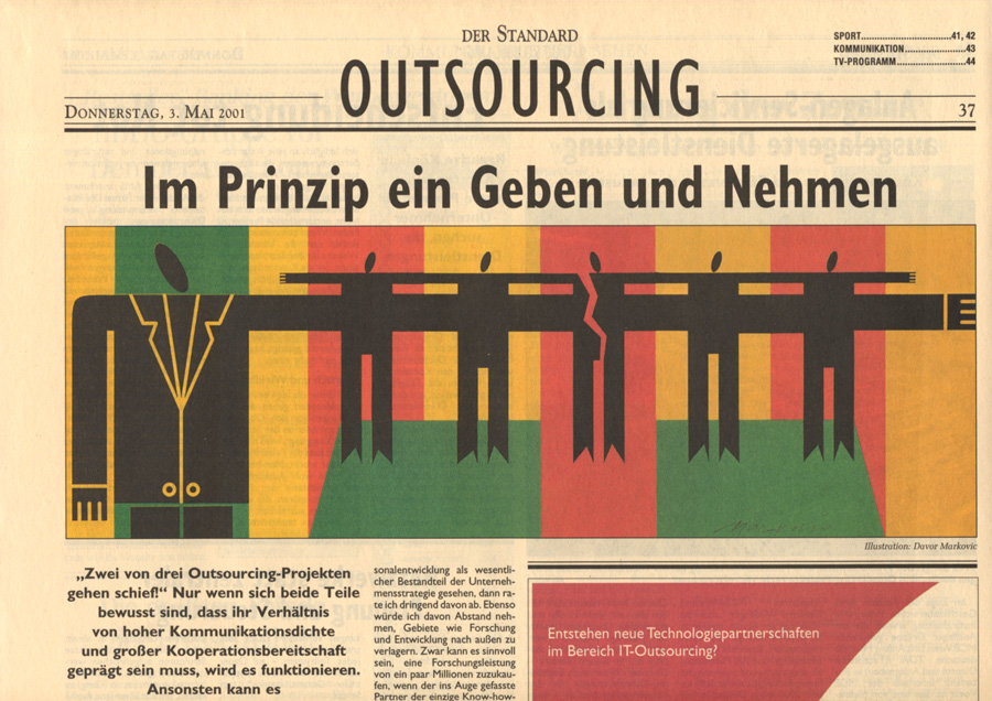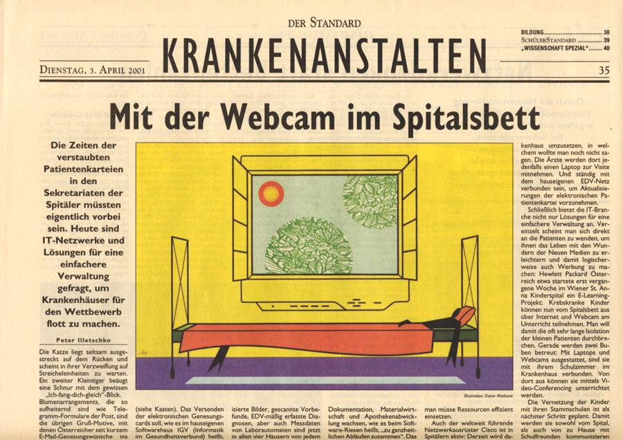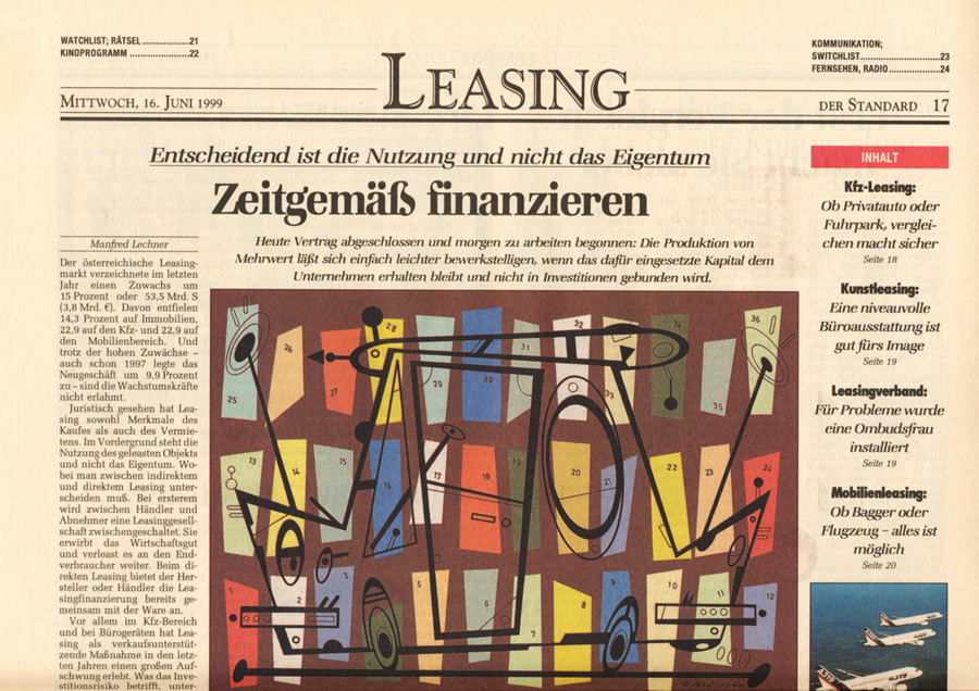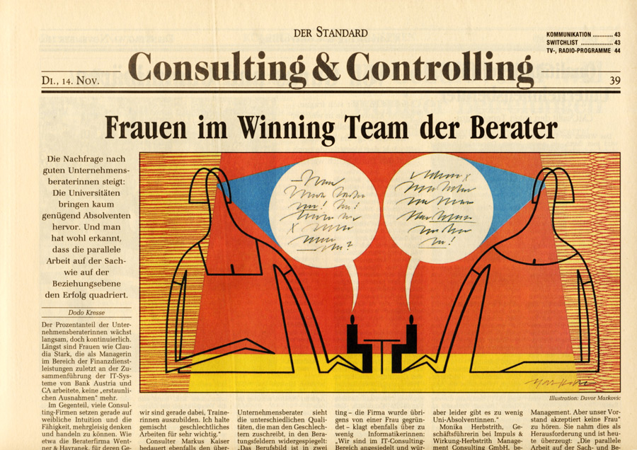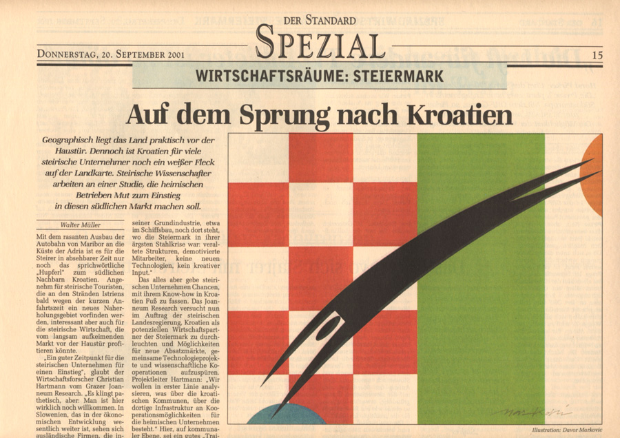 Auswahl von Illustrationen für die österreichische unabhängige Tageszeitung Der Standard, mit der sich im Laufe der 90-er Jahre eine intensive Zusammenarbeit entwickelte. Der Schwerpunkt lag dabei auf dem Illustrieren von Themen für verschiedene Verlagsbeilagen. Einige der Illustrationen wurden bei internationalen Grafikdesign-Ausstellungen präsentiert und im Jahr 2001 mit dem Double Merit from the Art Directors Club New York gekrönt. Art Director: Brigitta Bernart-Skarek.